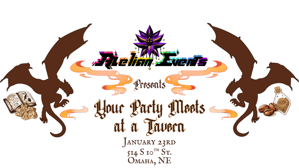 On January 23rd, we present our first ever installment of ‘Your Party Meets at a Tavern’, a combination D&D social and rave hosted by The Tavern Omaha. Featuring themed drinks, coffee by Dragon Roast, character creation sessions, worldbuilding discussions, and art and merch by Azelian Arts, there’s plenty for every fantasy nerd and raver to enjoy.